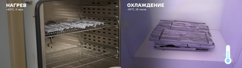 · испытание на светостойкость. Стабильность цвета фасадного материала — одна из главных характеристик его качества, поэтому при тестировании создаются максимально жесткие условия, имитирующие самые жаркие летние дни с периодическими обильными дождями. Образцы сайдинга помещаются в специальную установку на 1000 часов (почти 42 дня), фасадных панелей — на 2000 часов (84 дня). В течение всего этого времени в камере поддерживается высокая температура, а образцы попеременно облучаются ультрафиолетом и обильно смачиваются водой.