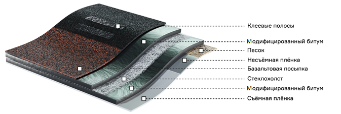 • структура — многослойная, основа — стеклохолст, покрытый с обеих сторон модифицированным битумом. Лицевой слой — посыпка из базальтовых гранул, создающая рисунок поверхности и защищающая битум от внешних воздействий. Тыльная поверхность посыпана мелкозернистым песком и заклеена защитными пленками — это необходимо для того, чтобы материал не слипался в пачках;